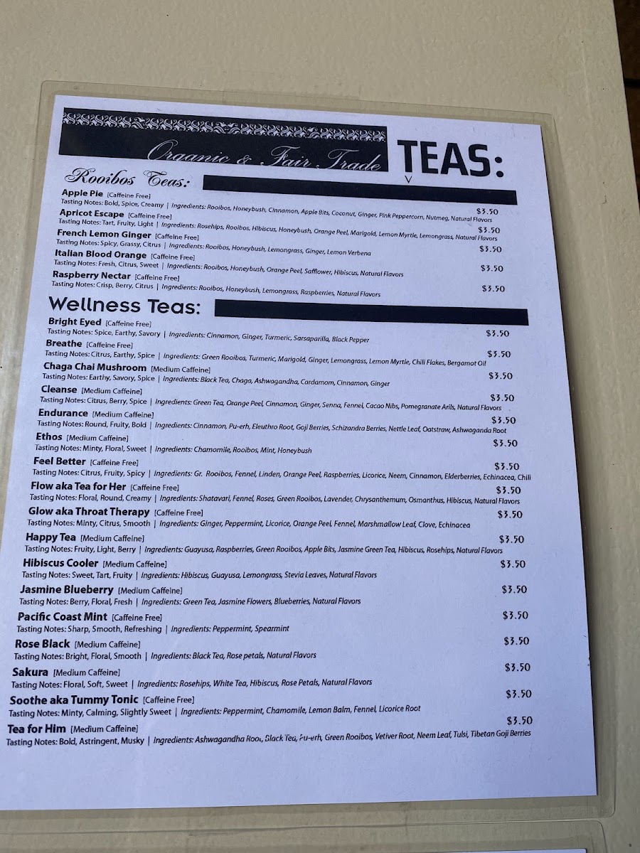 Coffee aficionados will delight in unique offerings such as the Cinderella Latte, Lavender Mocha, and the indulgent S’mores Mocha. For those seeking non-caffeinated options, the selection of caffeine-free teas includes refreshing flavors like Pacific Coast Mint and Apricot Escape.